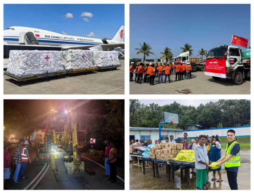 配圖左上:中國救援物資運抵科倫坡。配圖右上:中國港灣救援隊準備出發(fā)。配圖左下:中企救援隊伍夜間調度現(xiàn)場。配圖右下:中建斯里蘭卡分公司向受災民眾發(fā)放物資。韓博 攝